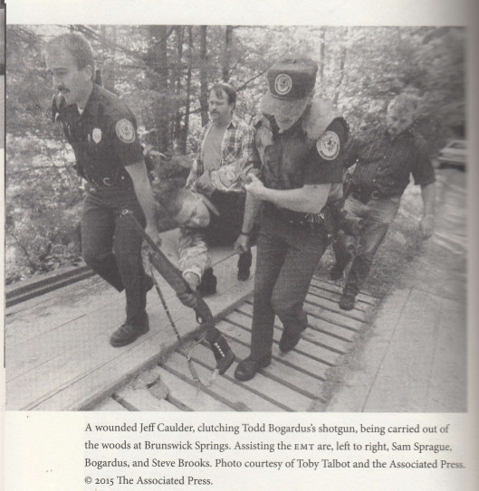 First, while Mr. Carey does an excellent job of identifying all of the law enforcement officers shown in the photos and such, he does not identify any of the EMTs. Observe the caption on the photo: “A wounded Jeff Caulder, clutching Todd Bogardus’s shotgun, being carried out of the woods at Brunswick Springs. Assisting the EMT are, left to right, Sam Sprague, Bogardus, and Steve Brooks. Photo courtesy of Toby Talbot, and the Associated Press.” How hard would it have been to identify “the EMT” as Dave Fuller of the Stratford Ambulance Corps? Law Enforcement wasn’t t